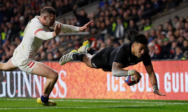 All Black Dalton Papalii scores a try during the Autumn Nations Series International rugby union match between England and New Zealand at Twickenham.